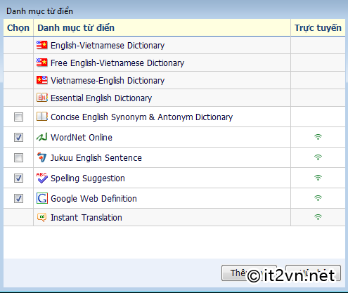Nếu chưa có nhóm từ bạn muốn tra thì bạn click Thêm mới/tại danh mục từ điển, tick chọn từ điển muốn thêm/ Chọn thêm mới